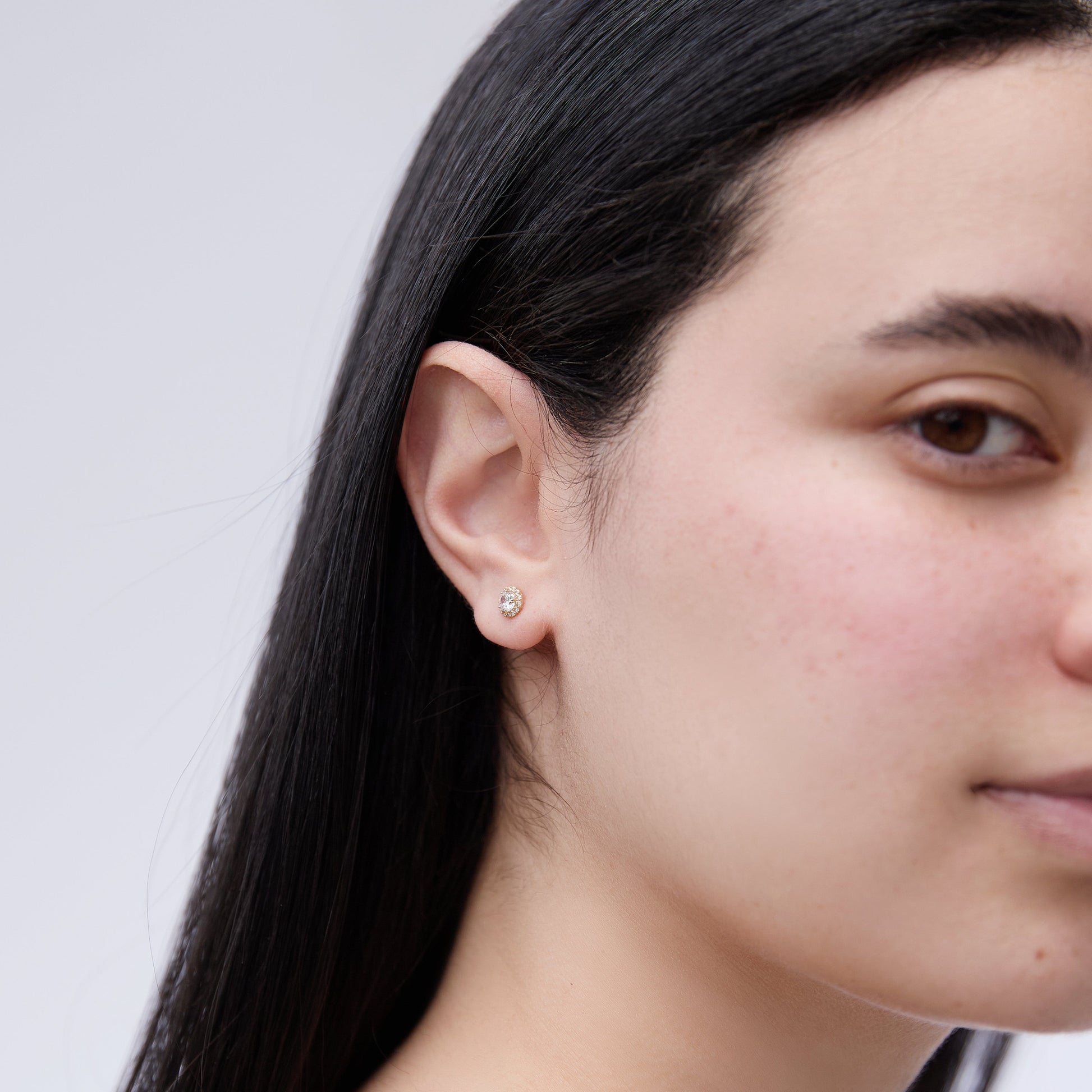 Delicately bold, undeniably perfect. La Perfección is a handcrafted 14K gold stud, designed with intention and encrusted with shimmering zirconias that catch every glance. It’s not too small, not too loud — just exquisitely right.