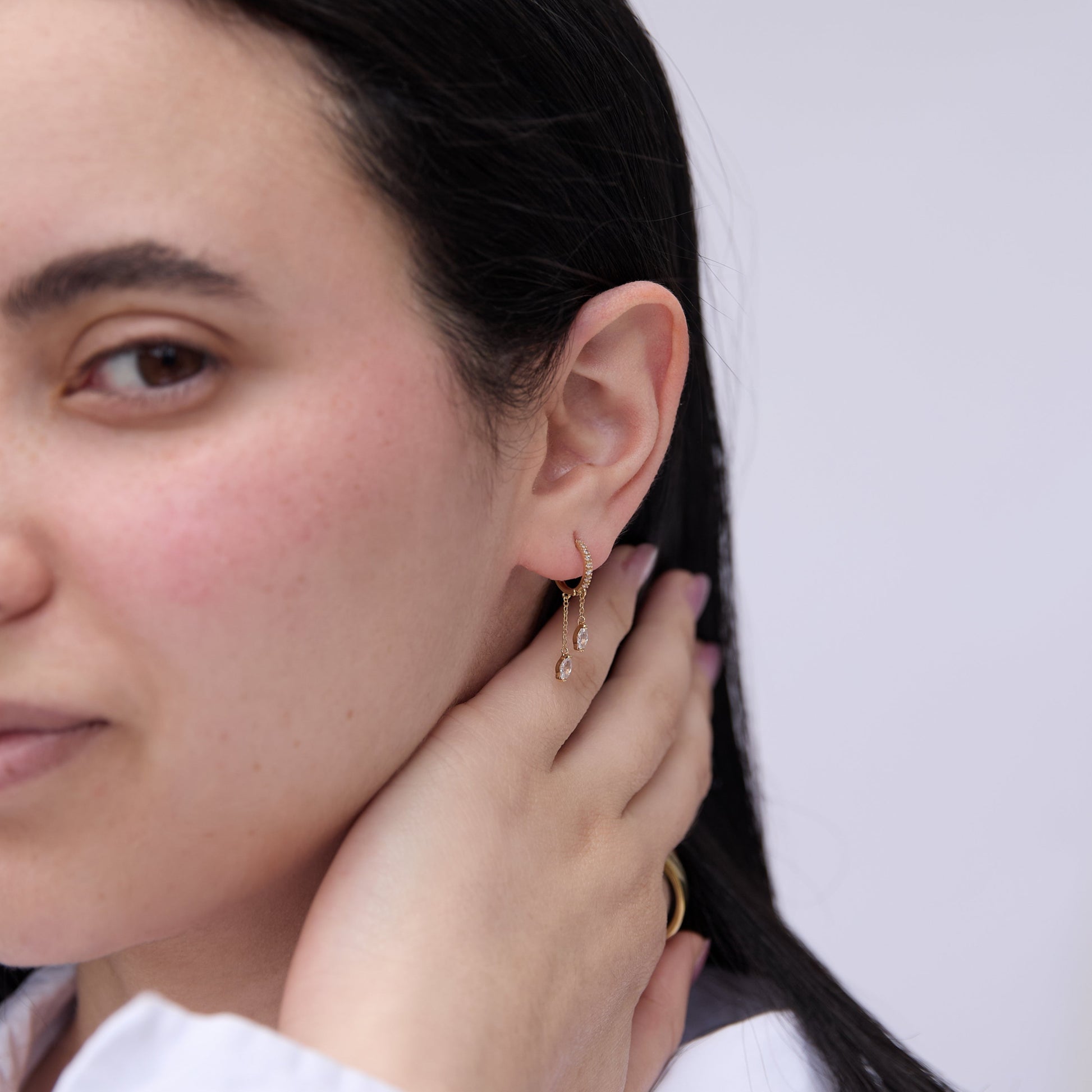 Crafted in pure 14K gold, just like every piece in our collection, these earrings are proof that power looks better when it shines. The bold hoop is paved with delicate zirconias, while two golden chains drop effortlessly, each ending with a brilliant zirconia stone — because one spark isn’t enough for you.